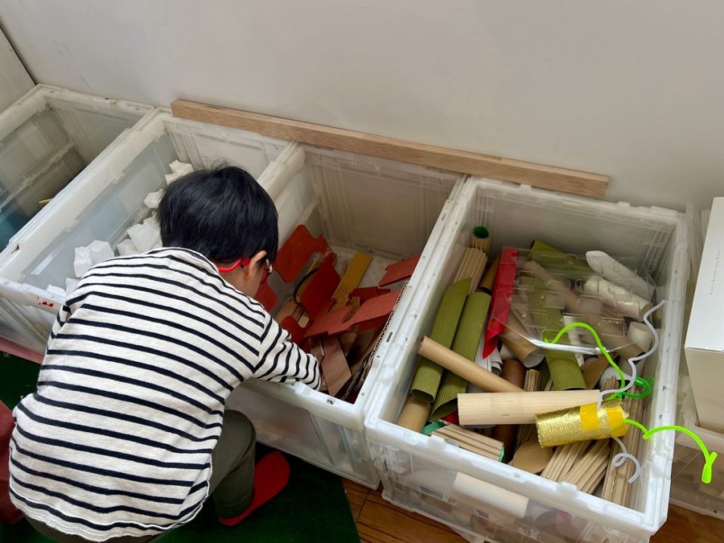 我が家の子どもたちは、素材から考えるより、まず何を作るかを考えるタイプのようでした。しっかり作りたいものを決めてから素材コーナーへ。でも、作りたいものを決めてから行くので、ない素材があって戸惑うことも。あるもので、代用できるようアイディアを変えるなどして、それも楽しそうでした。