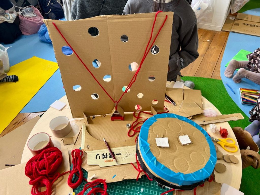 上の娘は、ヒモをつけた箱を、エレベーターのように操作して穴に入れる、段ボールで作ったゲームを作りました。自分だけのための作品ではなく、みんなと遊べる楽しいものを作りたかったそうです。