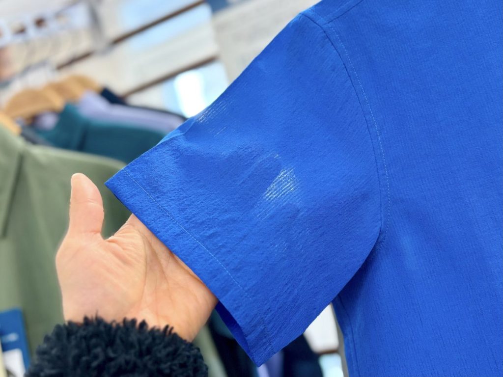 生地に触れてみると、どこかリネンのよう。ちょっとハリがあり、シャリシャリとした質感。程よい透け感があるので、夏場も涼やかに着こなせるでしょう。『モンベル』さんいわく「トレッキングにおすすめ」とのこと。筆者は夏の羽織りとしても着たいと感じました。