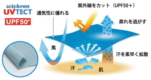 今シーズン、初登場した素材「WIC.(ウイックロン®) UVテクト」を採用したウェアにも注目!夏場の最強服といっても過言ではないシリーズです。