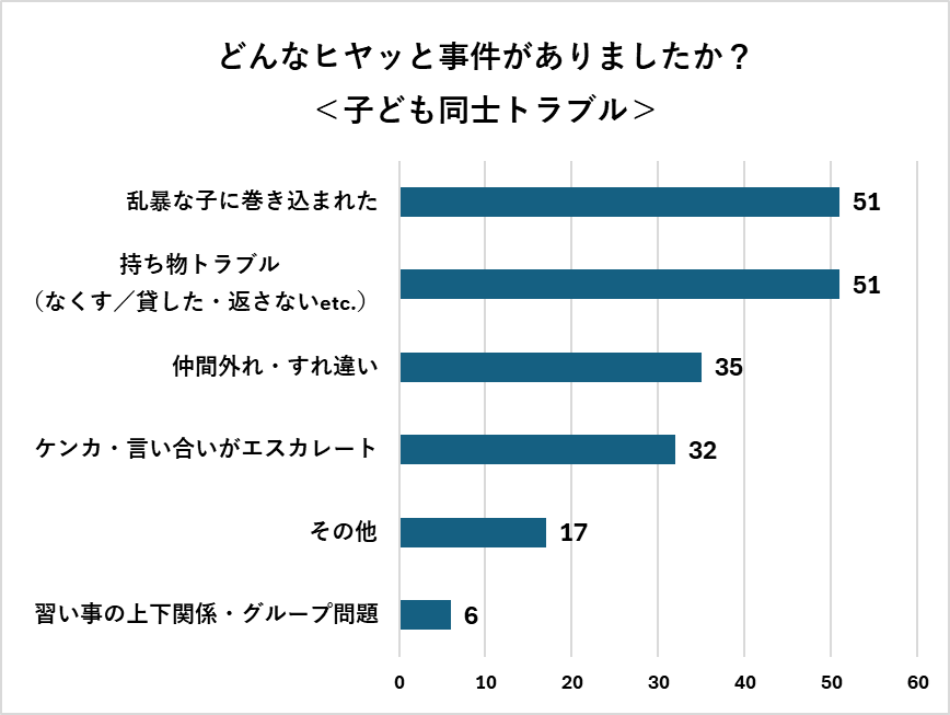 発生頻度は高くありませんが、一度起きると対応に時間がかかり、保護者が負担を感じやすいケースです。子どものことがきっかけでありながら、大人同士の関係にも目を向ける必要が出てくる場面もありそうです。