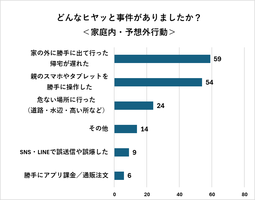 家庭の中や、親の管理下にあるはずの場面でも、予想外のできごとは少なくありません。もっとも多く選ばれたのは、「家の外に勝手に出ていった/帰宅が遅れた」で、59人が選びました。行動範囲は広がる一方で、行き先を保護者と共有する意識が、まだ十分に身についていない時期であることがうかがえます。また、現代ならではの項目として、「親のスマホやタブレットを勝手に操作した」と回答した人も54人にのぼりました。