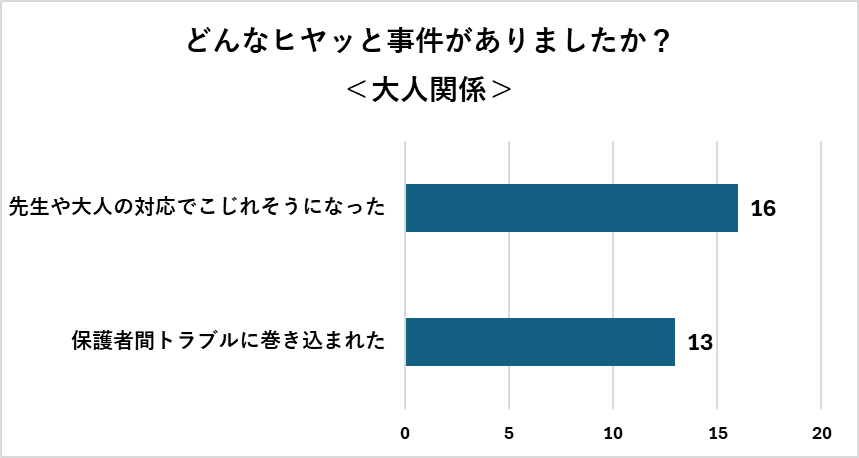 人間関係にまつわる経験も、保護者にとっては心に残るできごとになりやすいようです。誤解や行き違いが重なり、結果として大きな負担につながっている様子がうかがえました。