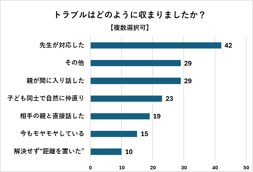 大人との関係に波及するケースも見られました。「先生や周囲の大人の対応をきっかけに、話がこじれそうになった」は16人、「保護者同士のトラブルに巻き込まれた」は13人の保護者が選択しています。