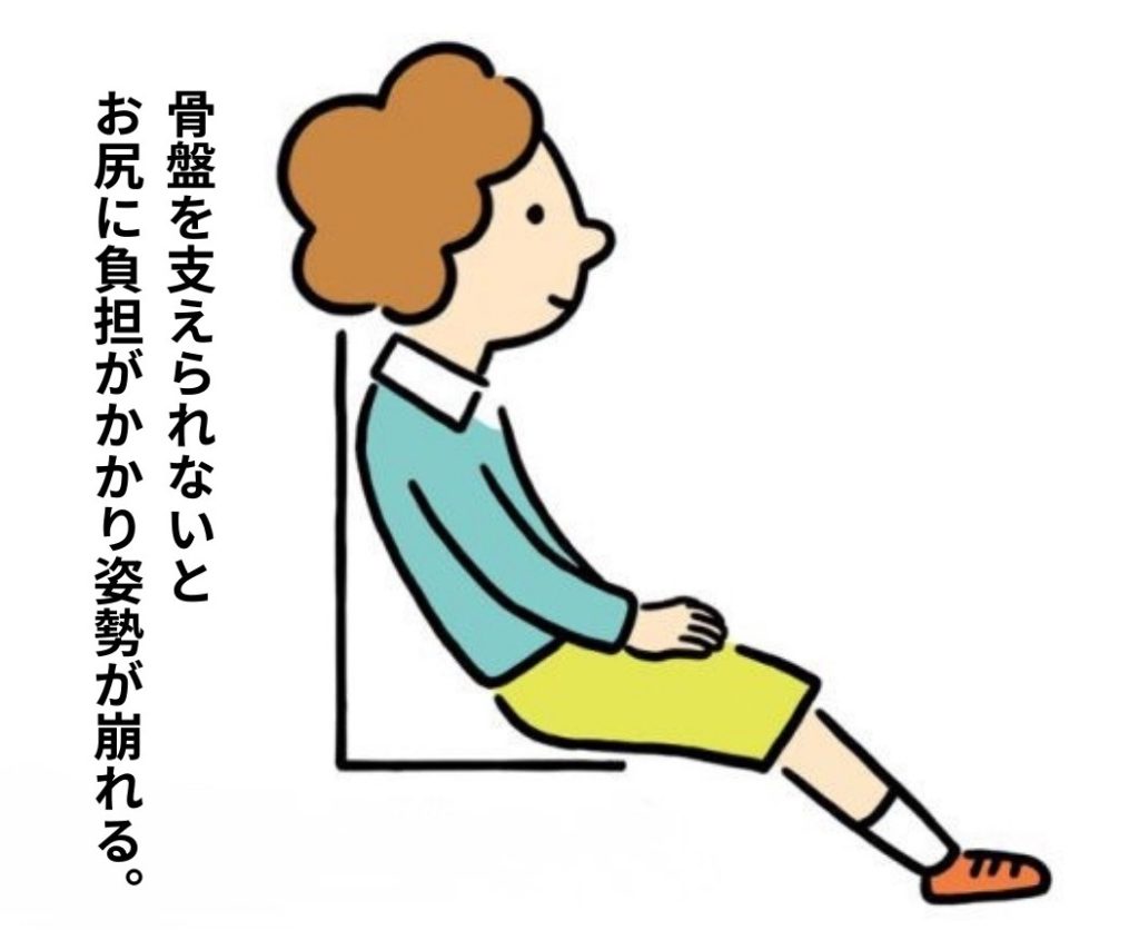 座ったときに自然と傾斜する骨盤を無理に起こしてしまうのが、太ももと上半身が90度の姿勢なのです。このため「正しい姿勢」は崩れやすく、長続きしません。傾いた骨盤を支えることができないと、お尻に負荷がかかり姿勢がくずれてしまうのです。