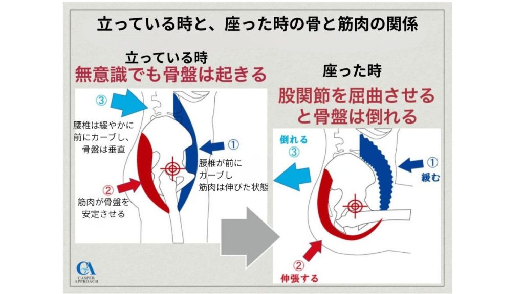 骨と筋肉の関係を知るとよくわかります。下は、立っているときと座ったときの骨と筋肉の関係を表した図です。立っているときの骨盤は腰椎にそって垂直。筋肉に支えられて安定してます。意識しなくても骨盤は起きた状態です。