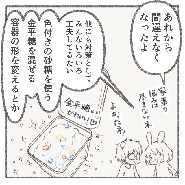 調べたら各家庭によって対策はさまざまでした。いろいろアイデアがあるようでしたが、中でも金平糖を混ぜているというご家庭の案がかわいい! と思いました。工夫して楽にしていきたいですね!