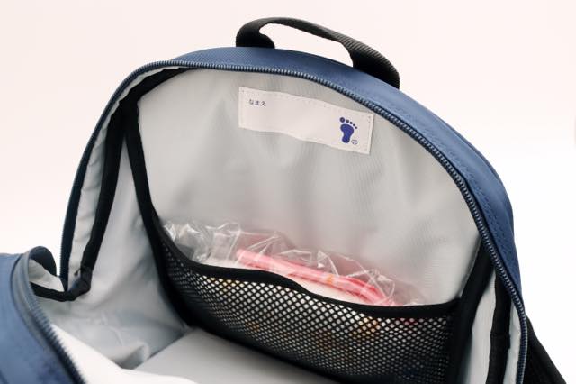 ファスナーを開いた正面には大きくしっかりと名前が書けるタグがあり、他のお友達のものと間違えることが減らせます。