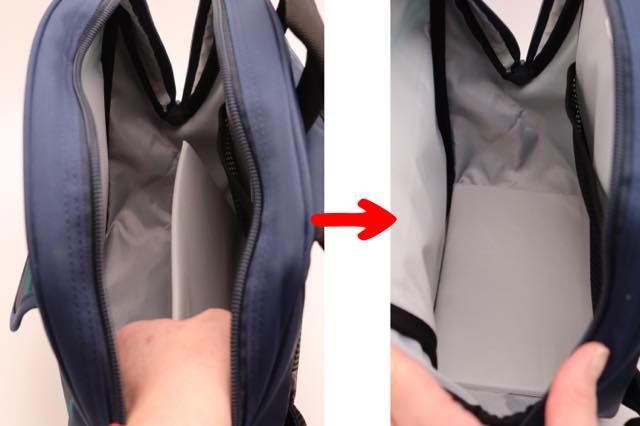 かつ、底板は一辺がリュックに取り付けられているのでズレる心配がありません。もちろん、荷物が少ないときには底板を立てると「えんりゅっく」を薄い状態にすることができます。
