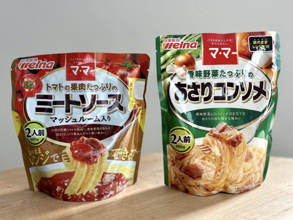 パスタ製品を豊富にラインナップする『日清製粉welna』。「マ・マー トマトの果肉たっぷりのミートソース マッシュルーム入り」は、お肉と完熟トマトの果肉がごろごろ。「マ・マー 香味野菜たっぷりのあさりコンソメ」は、香味野菜と白ワインが引き立てるあさりのうまみ豊かな味わいです。