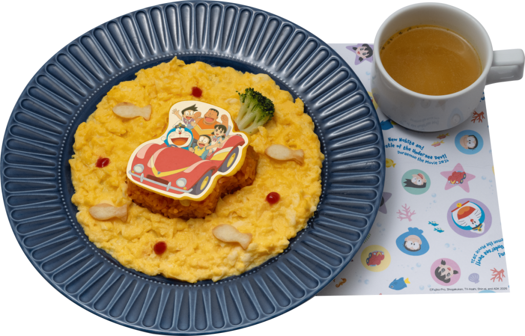 今回の映画に登場するひみつ道具「水中バギー」のオムライスです。ふわふわの卵と、ケチャップの甘みが相性抜群!