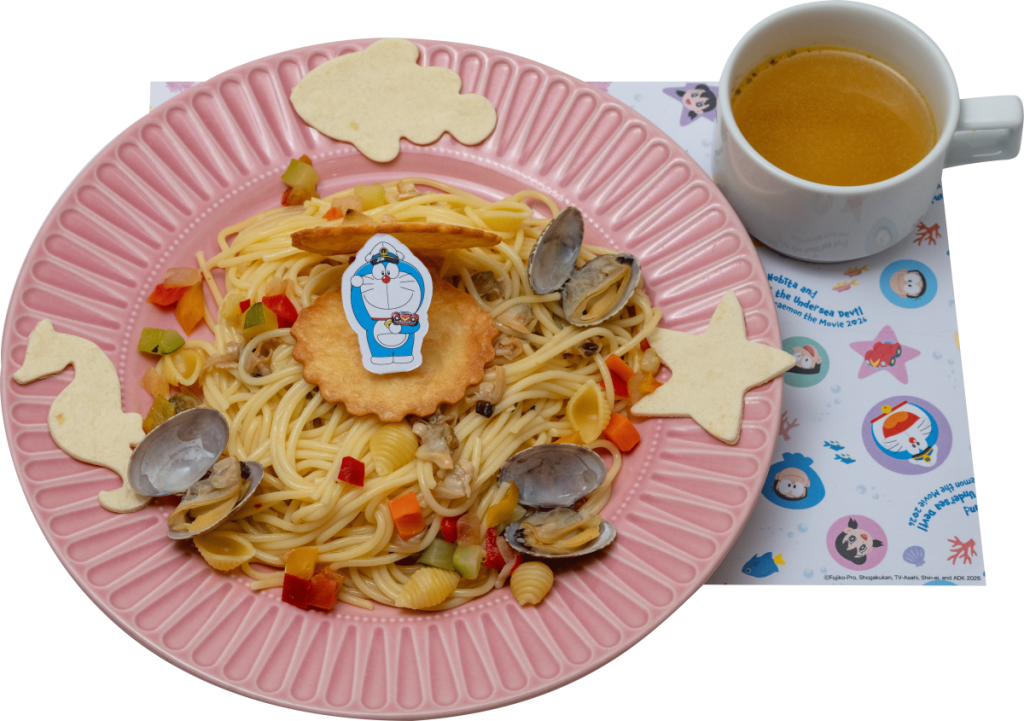 映画にも登場する「カメレオンぼうし」を被ったドラえもんがとってもキュート!隠し味のハマグリと昆布茶で深みを醸し出し、アサリの旨味が凝縮したソースをからめた麺がポイントの、見た目でも味でも海を感じることができるパスタです。
