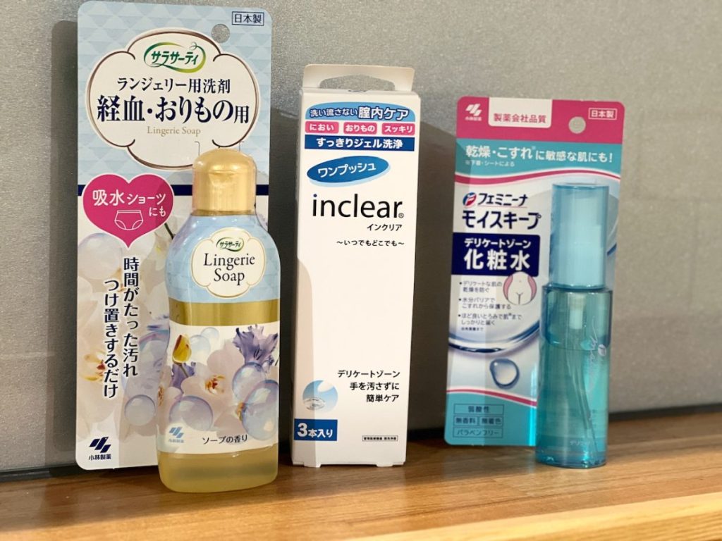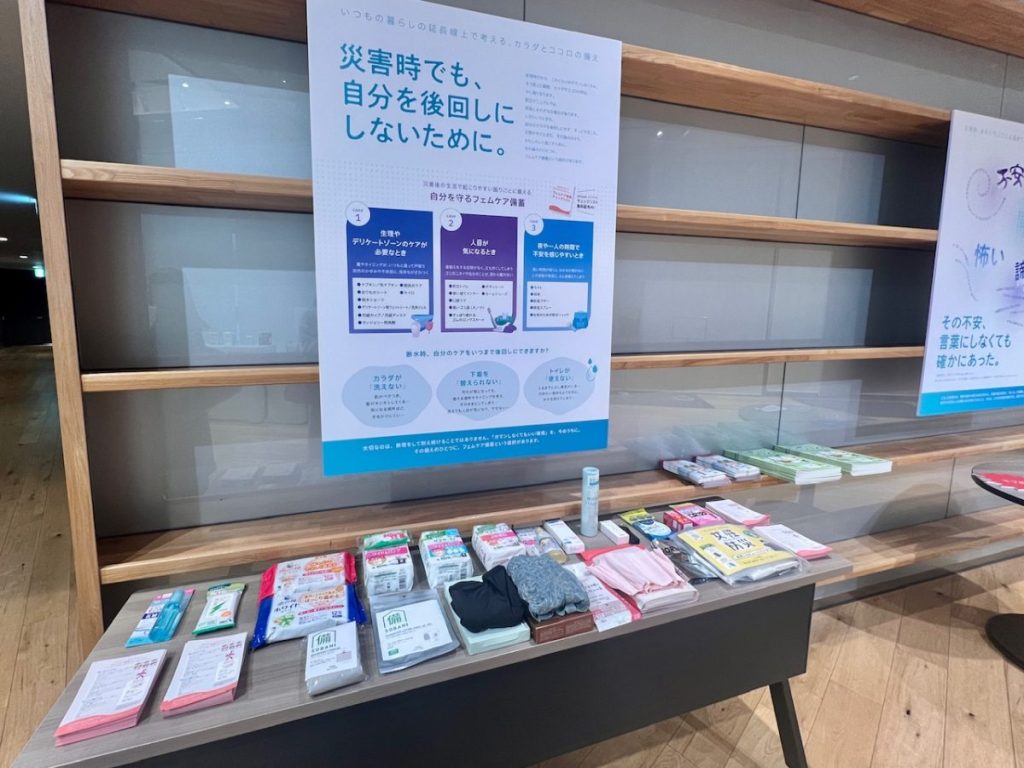 そのほか、経血・おりもの用の洗剤やデリケートゾーンの洗浄液、化粧水など、あれば安心なフェムケア製品も並んでいました。どれもコンパクトなサイズなので、普段から洗面所などに余分に用意して、いざというときに持ち出せるよう準備しておくとよいと感じました。