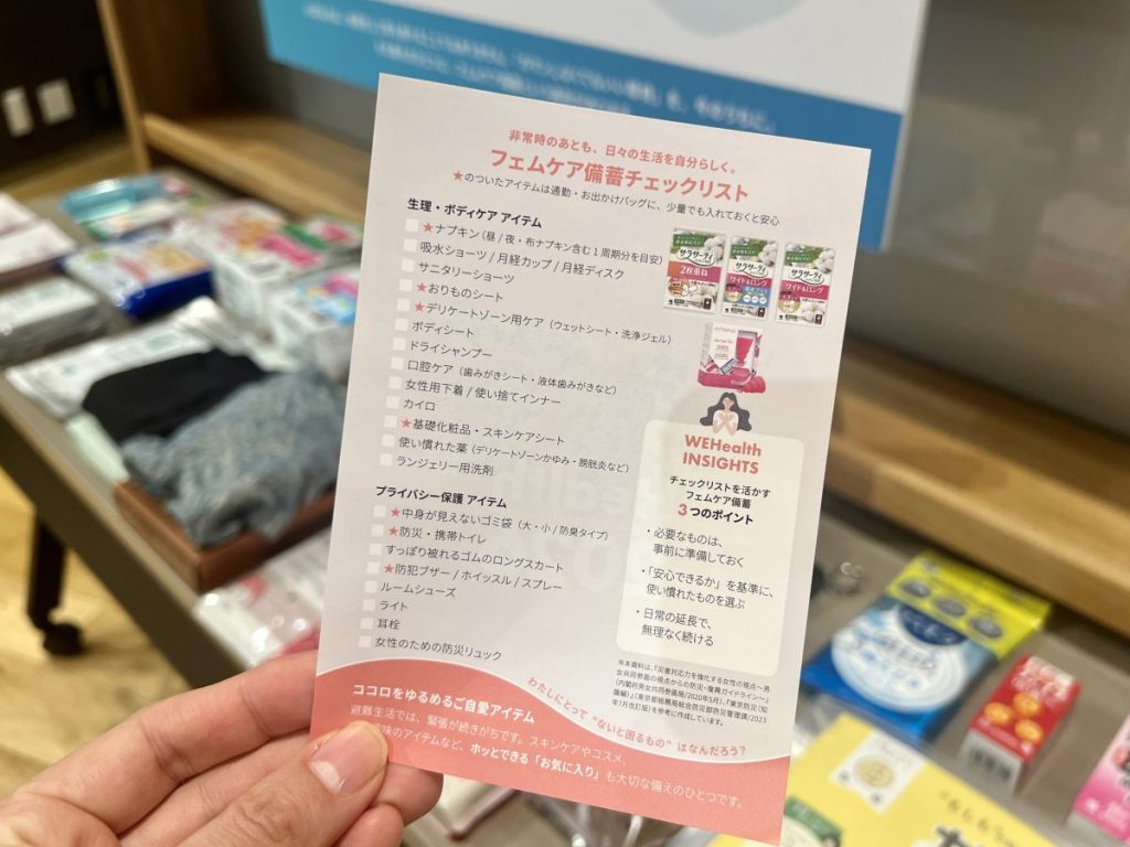 会場では、具体的に何が必要かが分かる、WEHealthオリジナル「フェムケア備蓄チェックシート」が配付されました。ナプキン、吸水ショーツなど生理関連のものから、中身が見えないゴミ袋や着替えなどに使えるロングスカートなど、プライバシー保護のアイテムなど、女性に必要なものがリストにまとめられています。