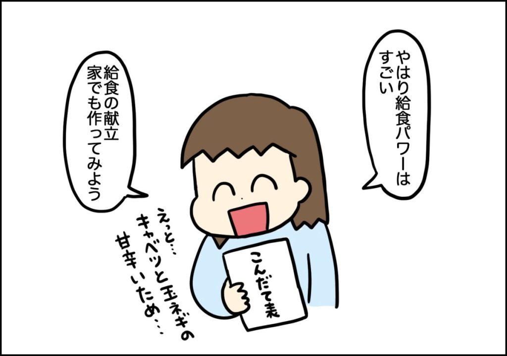 給食は集団生活の中、食べないといけないという雰囲気で食べるんでしょうか。本当に、3食中1食でも栄養のあるものを食べているのは安心で、ありがたいです。