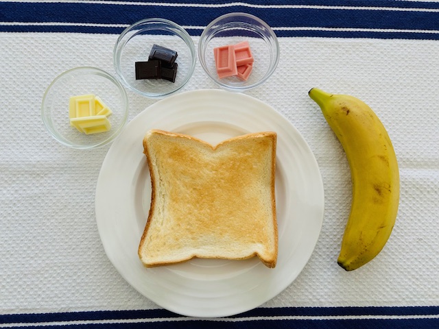 まずは【初級編】から。焼いてのせるだけの「溶かしチョコとバナナのトースト」を作りましょう♪ バナナは糖質やカリウムがバランスよく含まれていて消化もよいので、おやつにぴったりな食材です。チョコとバナナの組み合わせは、言わずと知れた鉄板ですね。