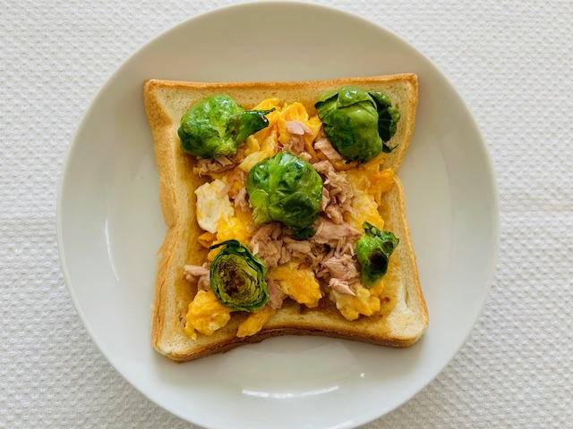 5. 4にスクランブルエッグと芽キャベツ、ツナをのせれば完成です!