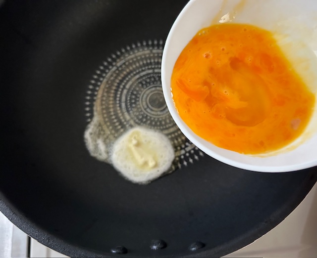 2.フライパンにバターを熱し、1を流し入れる。