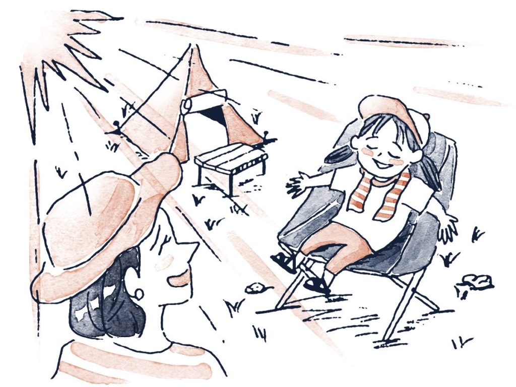 夫がテントを張る傍らで、娘たちは自分の椅子を組み立てる。小さな手で手伝いながら、ようやく完成した椅子。腰を下ろした次女が、ふぅと息をついて言った。