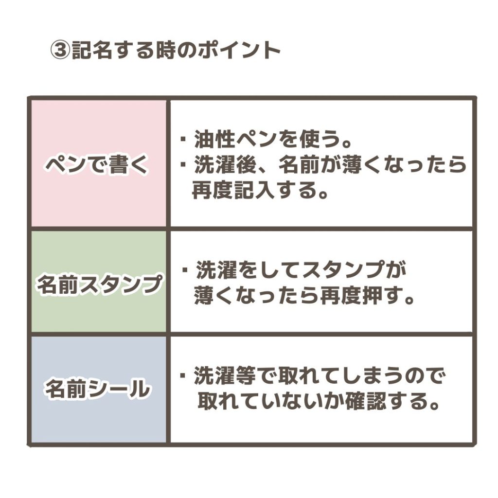 ①全ての持ち物に記名する。
