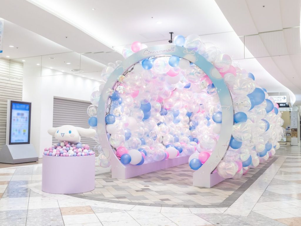 きらめくホログラム調バルーンに包まれた道の先ではシナモロールが待っていて、子どもが思わず立ち止まるような“シャボン玉の世界”を、親子でいっしょに楽しみながら撮影できます。