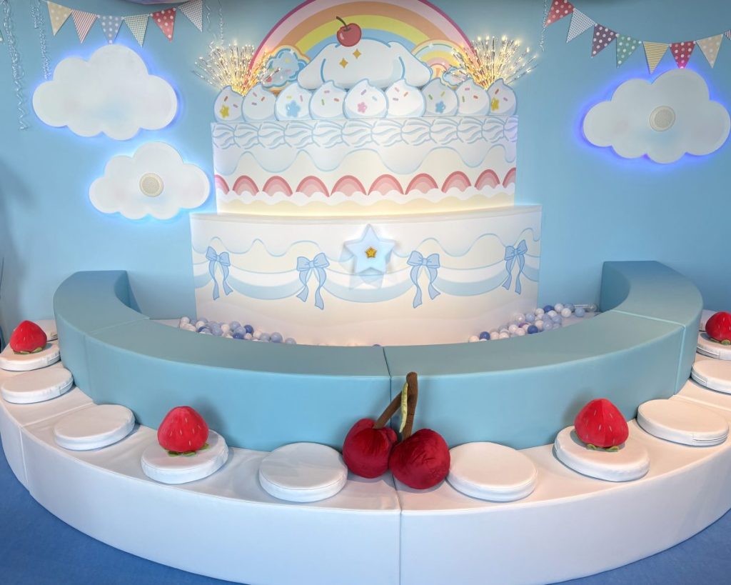 ゲートをくぐった瞬間、視界いっぱいに飛び込んでくるのは、シナモロールをお祝いするために用意された、どーんと大きなバースデーケーキ。