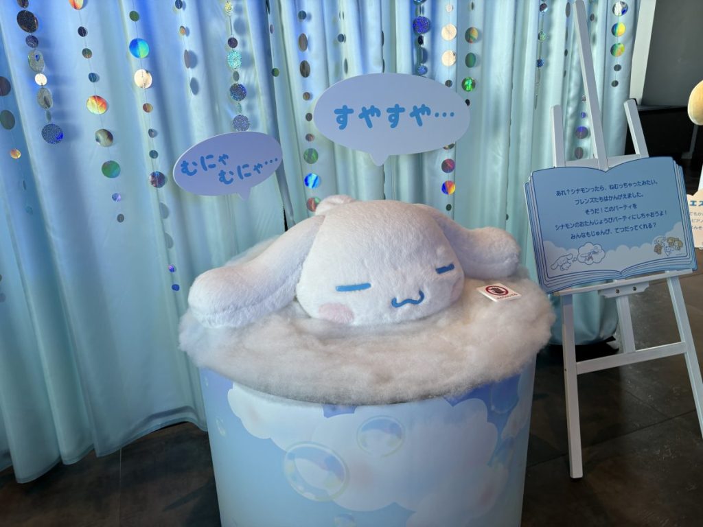 物語では、眠ってしまったシナモロールを見たお友だちが、「そうだ! 眠っている間に誕生日会の準備をしよう」とひらめく──。そんなかわいいエピソードが、そっとこの空間に流れています。