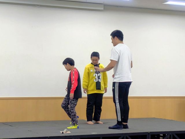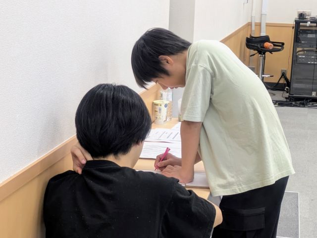 ネタ作りが始まると、教室の雰囲気は一変。それぞれが顔を寄せ合いながら、「この設定どう?」「こっちのほうが面白いかも」とアイデアを出し合い、真剣にネタを考えていました。講師に相談しながらネタをブラッシュアップする姿も見られます。舞台に上がって動きや“間”を確認する様子は、まるでプロのようです。
