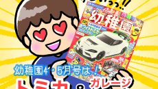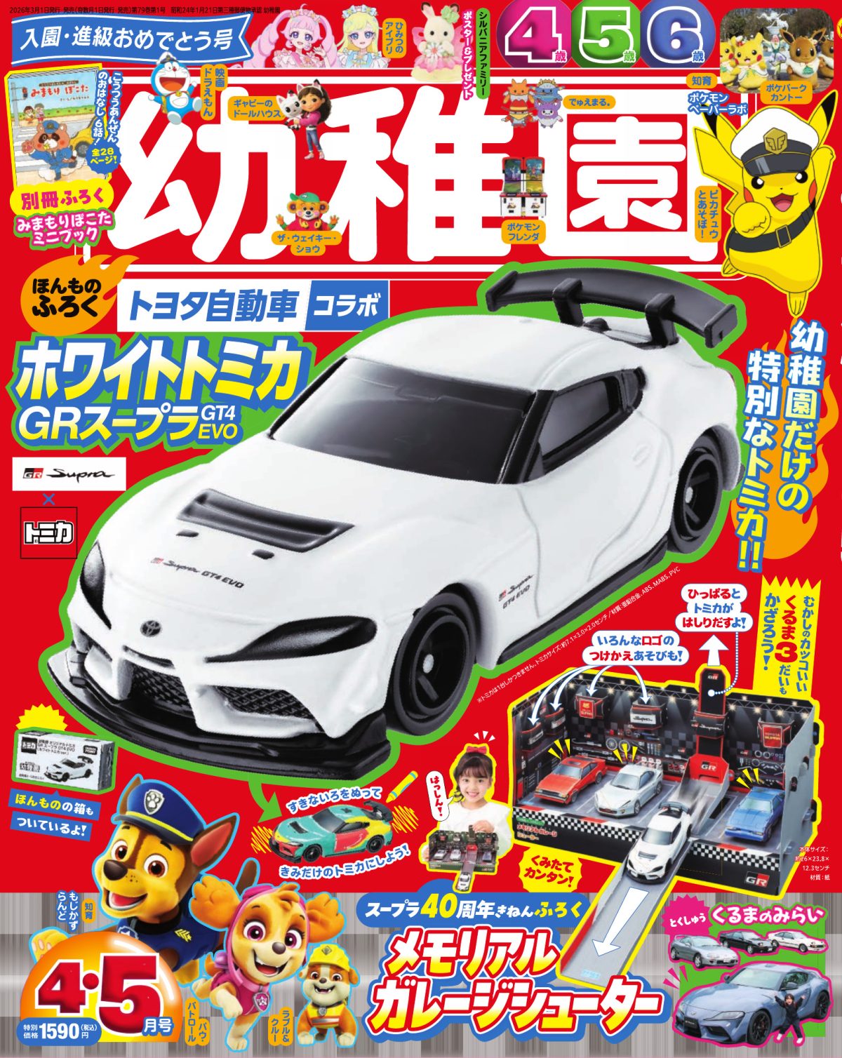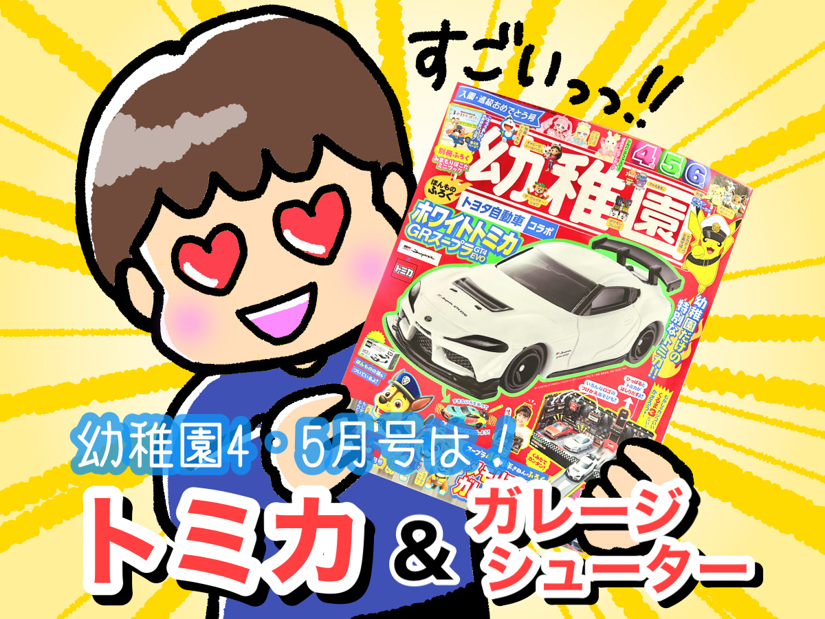2026年4・5月号は『トミカ』とコラボしたトヨタ「GRスープラ GT4 EVO」の「ホワイトトミカ」です。かっこいいスポーツカーが『幼稚園』でオリジナルトミカになりました! ペンなどで自由に描きこんで、自分だけのかっこいいトミカを作っちゃおう!