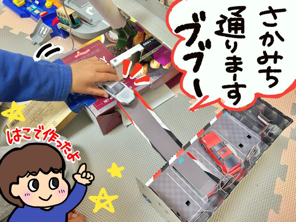 ハマって遊んだ翌日、息子は幼稚園の自由工作で箱のおもちゃを作ってきました! 車が走れる道がついていたり、坂道がついていたり…今回の付録に影響を受けたのでしょう。ガレージシューターと組み合わせていろいろと遊んでいました。