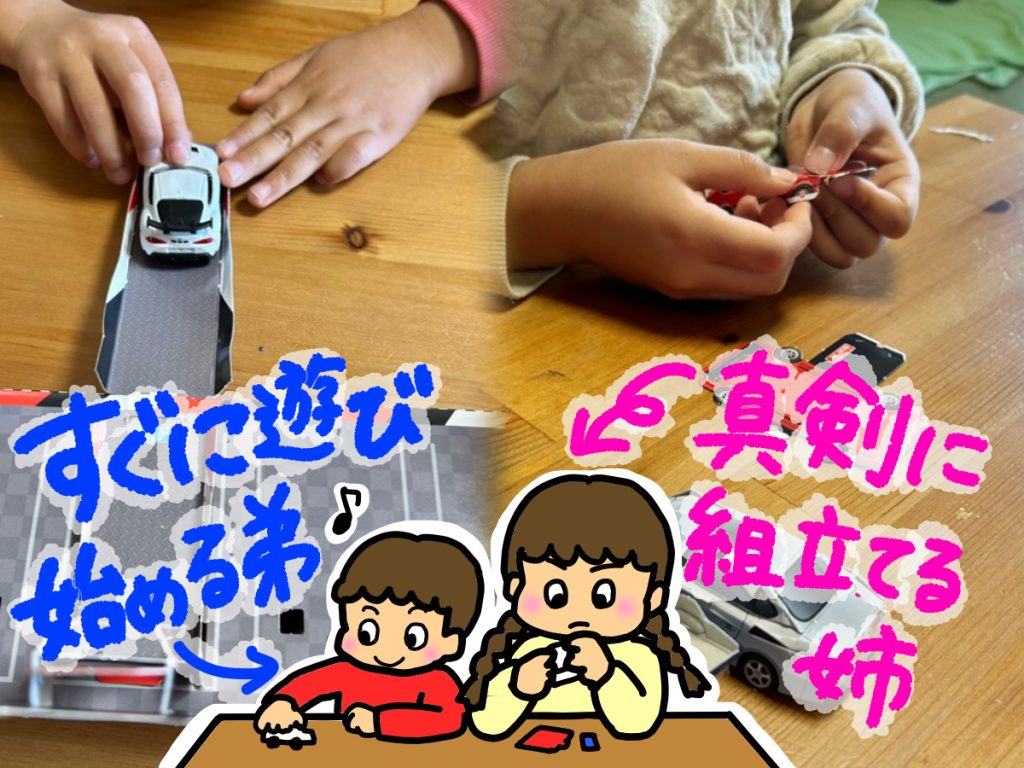 ところが、坂道パーツを作り終わったら、息子はそれだけを持ってさっそく近くの本や家具の段差にセットし始めました。そして、車を滑らせて大笑い。どうしてこう、スピードが出るものや自分で動かすものが大好きなんでしょう? 「まだ完成してないよ?!」とお姉ちゃんと私が言ってもお構いなしです。