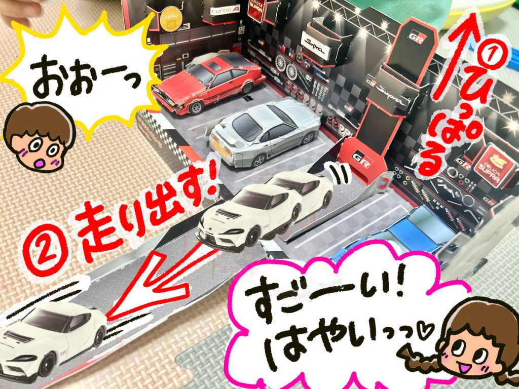 また、スープラ誕生40周年記念の「メモリアルガレージシューター」も! 付録の「ホワイトトミカ」や、お家にあるトミカを発車させて楽しんでください♪