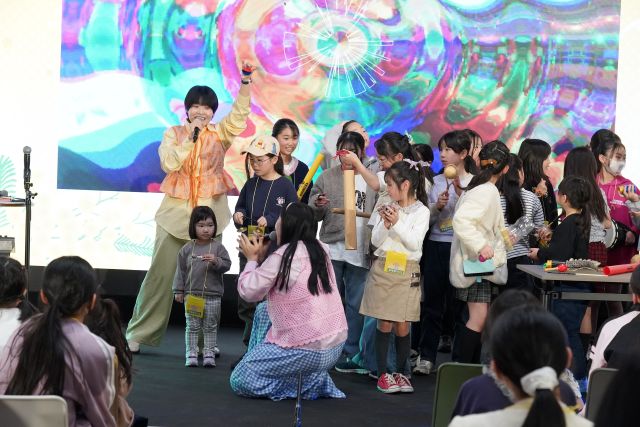 ステージでは、子どもたちが実際に上がって参加する場面も。楽器を手に取り、みんなでリズムを刻みながら演奏に挑戦します。会場全体がひとつの音に包まれ、音楽と数学を身近に感じられる時間となりました。