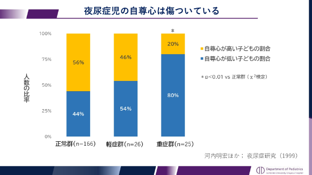 夜尿症の子どもの自尊心についての調査でも、重症の夜尿症の子では自尊心が低い割合が8割にのぼるという結果が出ています。夜尿症を抱えた子どもたちは、表面上は「別に(治療しても、しなくても)どっちでもいい」と言っていても、内心では深く傷ついていることが少なくないのです。