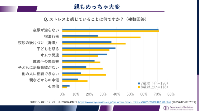 夜尿症がつらいのは、子どもだけではありません。保護者への調査では、約8割の保護者が「夜尿はストレスだ」と感じていました。その理由として多く挙げられたのが、朝の片付けや洗濯といった物理的な負担だけでなく、「子どもに治療意欲が見られないように感じる」「子どもを怒ってしまう」といった感情的な側面でした。
