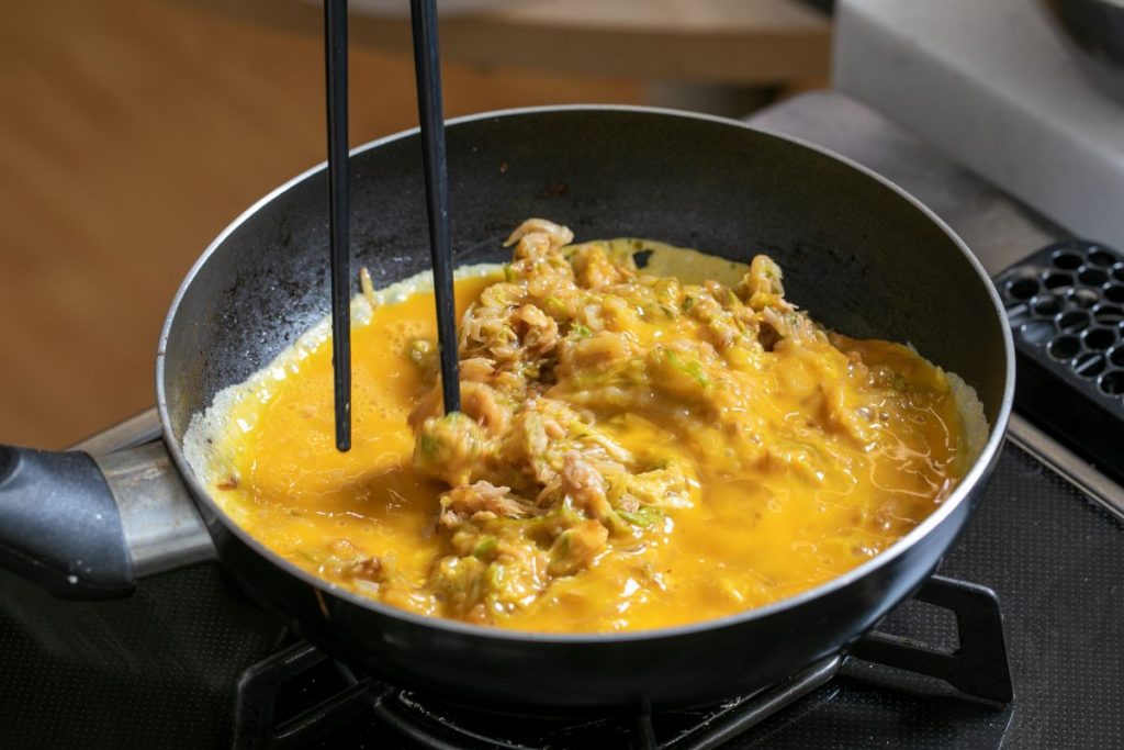 卵を流し入れているところ。フタをして両面焼く