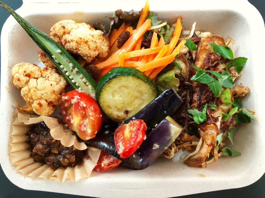 「お惣菜アワード2020」優秀賞の一品、「屋台風プルドチキン弁当」。アメリカ南部BBQ料理のプルドポークをチキンで表現