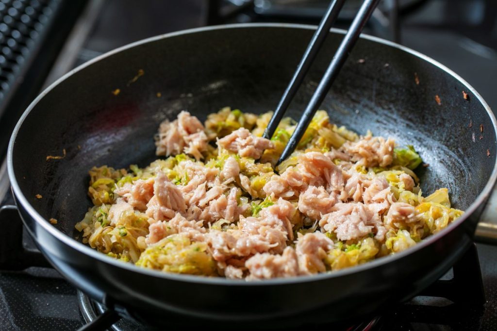 カサはここまで減ります。ツナを混ぜているところ