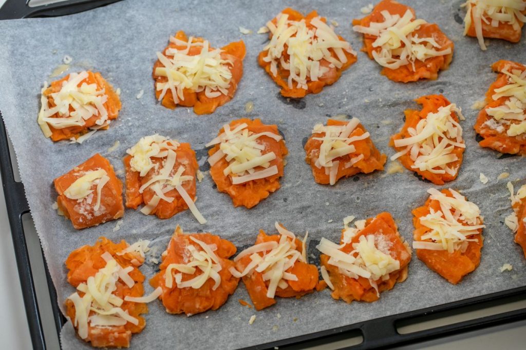 3.オーブンのトレーに2を並べ、グラスの底などで平らにつぶす。その上にピザ用チーズをひとつまみずつのせ、オリーブ油をかけてオーブンに入れて、15~20分焼く。