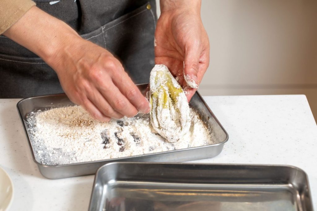 1.加熱したナスを縦半分に切り目を入れて開く。バットなどに小麦粉、粉山椒を入れて混ぜ合わせ、ナス全体にまぶす。