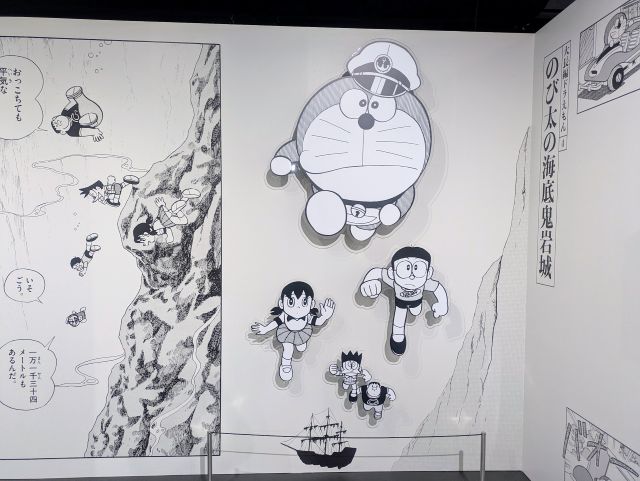 大長編ドラえもんに焦点を当てた展示では、作品の世界観を表現した演出や原画が並び、物語の世界を立体的に感じられる空間が広がっています。壁面には印象的なシーンが描かれ、まるで作品の中に入り込んだかのような感覚に。