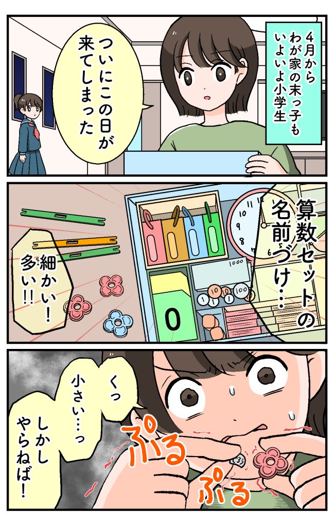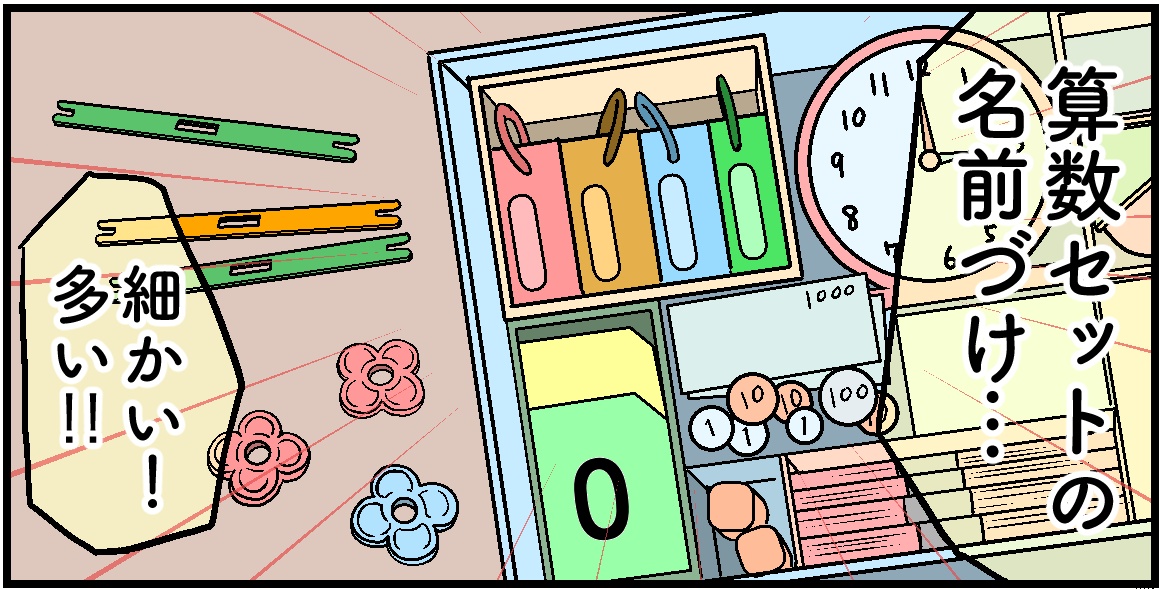 名前付けは「小学校でも頑張ってね!」の気持ちを込めて書いていますが、算数セットは無心! 「やらなきゃ! 間に合わせなくちゃ」という気持ちです笑。