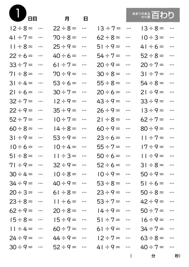 私が校長を務めていた広島県尾道市の土堂小学校(当時)では、この最もやっかいな、あまりを出すときのひき算がくり下がりになるわり算100題を1枚のプリントにし、「百わり」と名付けて教材にしていました。