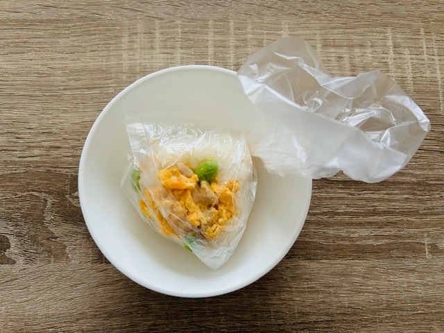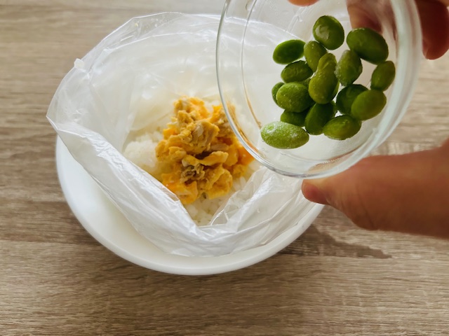 2.ポリ袋にご飯を入れ、ツナ炒り卵と枝豆を加える。