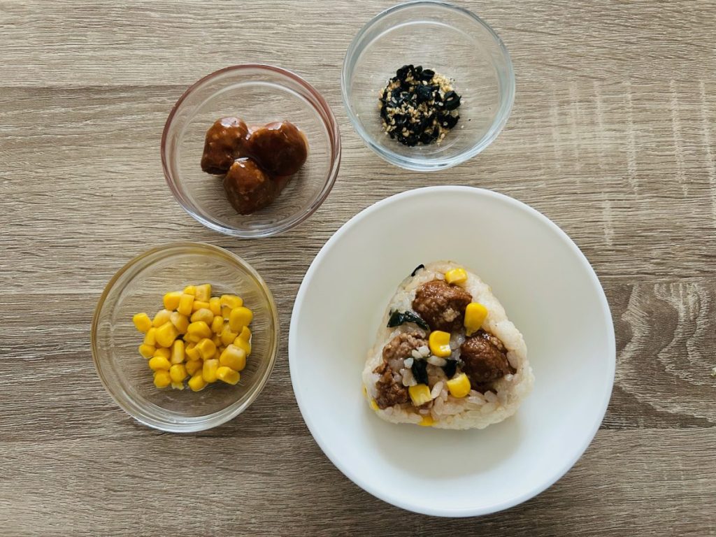 食べ応え抜群のおにぎりはコーンのプチプチ感もごちそう!「ミートボール×コーン×わかめのおにぎり」