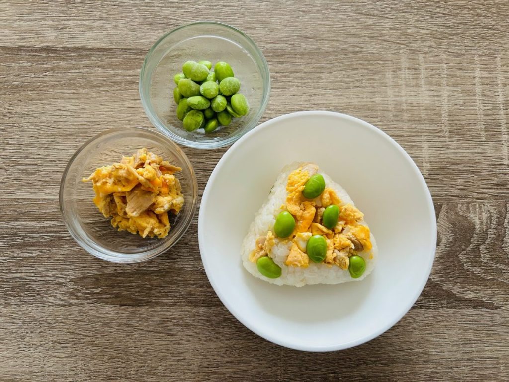 では、さっそく作っていきましょう! まず「枝豆とツナ炒り卵」から。卵は完全栄養食といわれていますが、ビタミンCが不足しています。枝豆のビタミンCを加えながらツナでたんぱく質を強化したおにぎりがこちら⤵