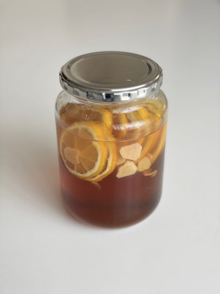 煮沸消毒した瓶に、輪切りにしたレモン2個分、生姜10g、ハチミツ200gを入れ漬けるだけでレモネードを常備できます。レモネード原液を、炭酸水で薄めて飲んだり、お湯で割ってホットレモネードにしてもいいでしょう。