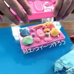 ポムポムプリンのおしりを手で左右に動かすことができます。手で押して走らせると粘⼟などに模様が付けられます。