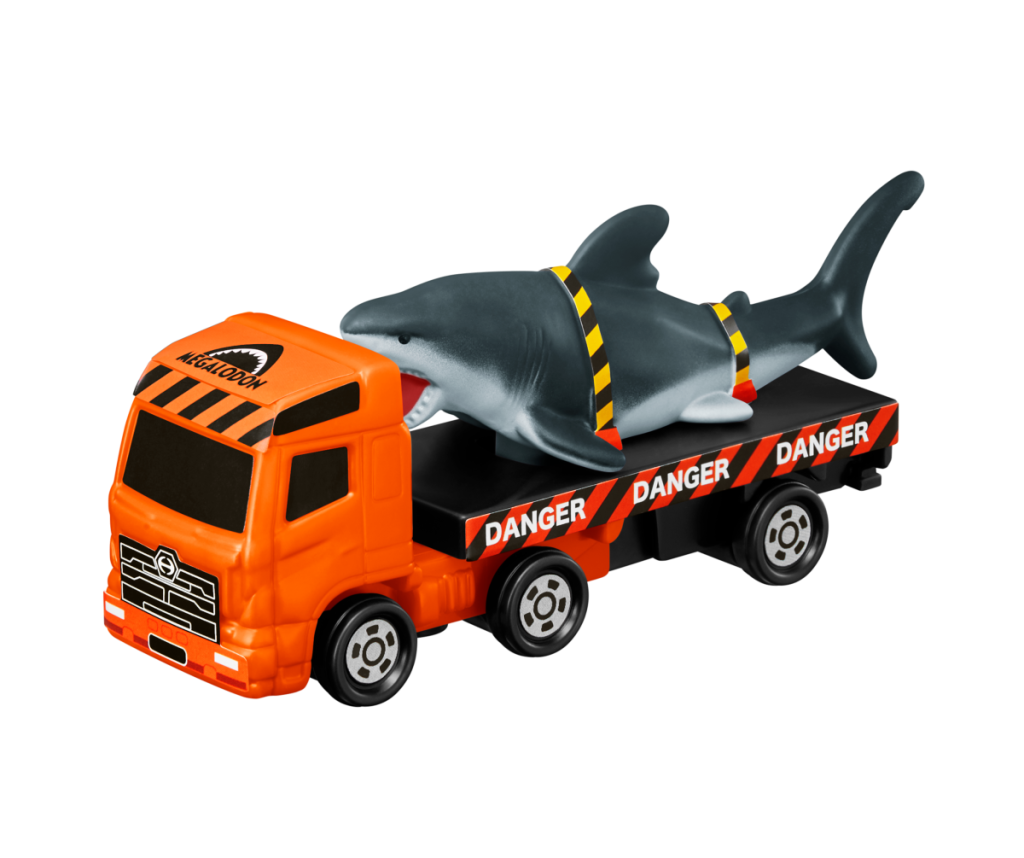 巨大サメ「メガロドン」を搬送するトラックのおもちゃです。メガロドンは手で左右に動かすことができます。
