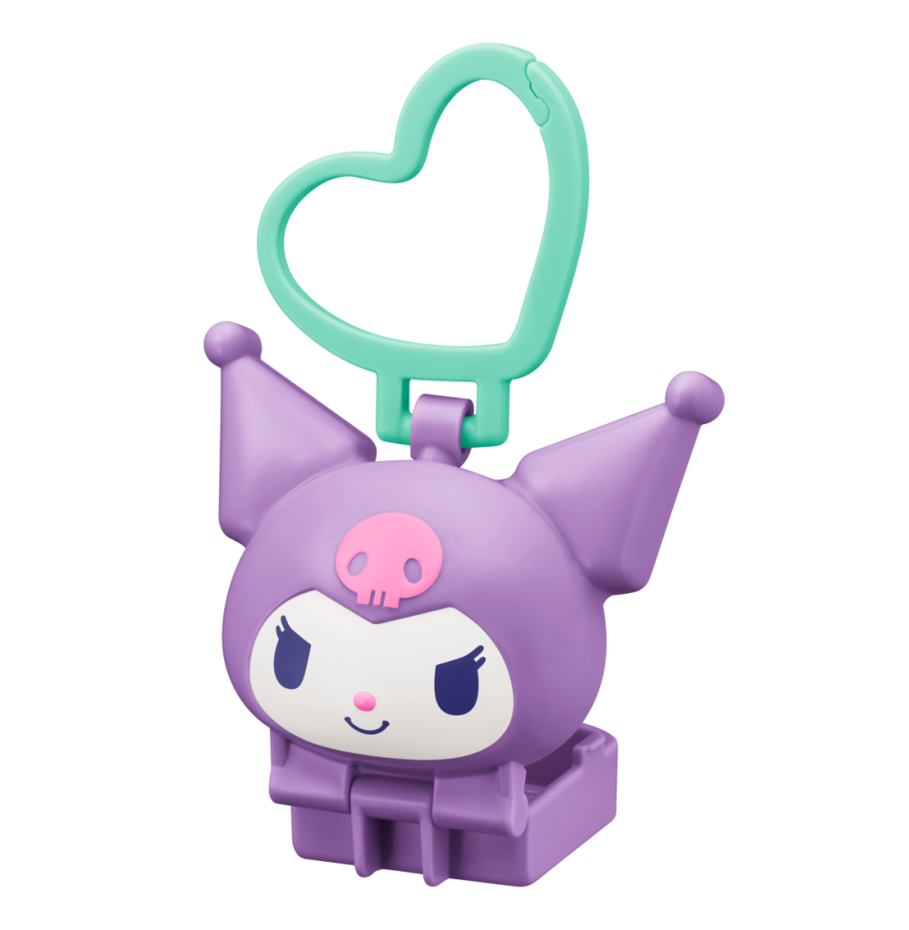 クロミの顔部分を開くとケータイ型の小物入れになり、かばんなどに付けて持ち歩くことができるフィギュア型キーリングのおもちゃです。付属のシールを貼って待ち受け画面の再現や、デコレーションすることができます。